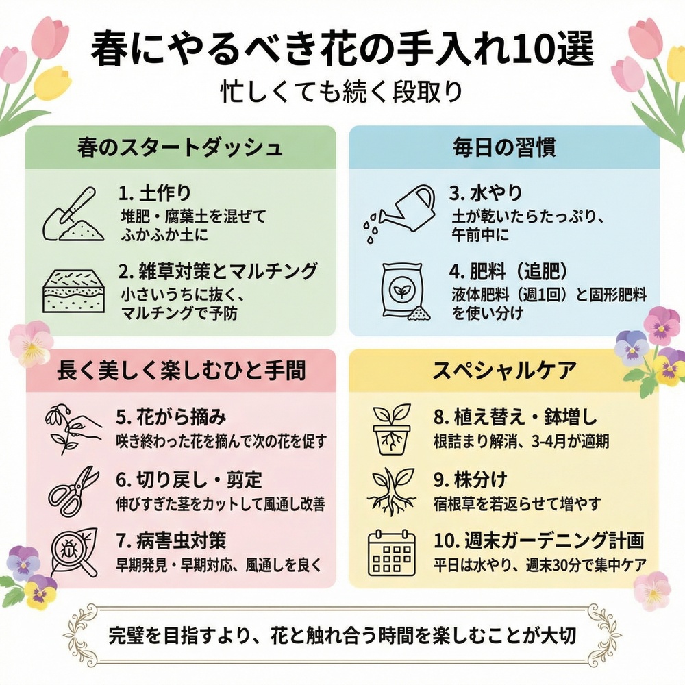 こんにちは!花農家の田中花子です。長年、畑でたくさんの花を育ててきた経験から、今日は皆さんに、忙しい毎日の中でも無理なく続けられる「春の花の手入れ10のポイント」を、段取りよく進めるコツと一緒にお届けします。この記事を読めば、春のガーデニングがもっと楽しく、効率的になりますよ。難しいことはありませんので、一緒に春の庭仕事を楽しんでいきましょう!